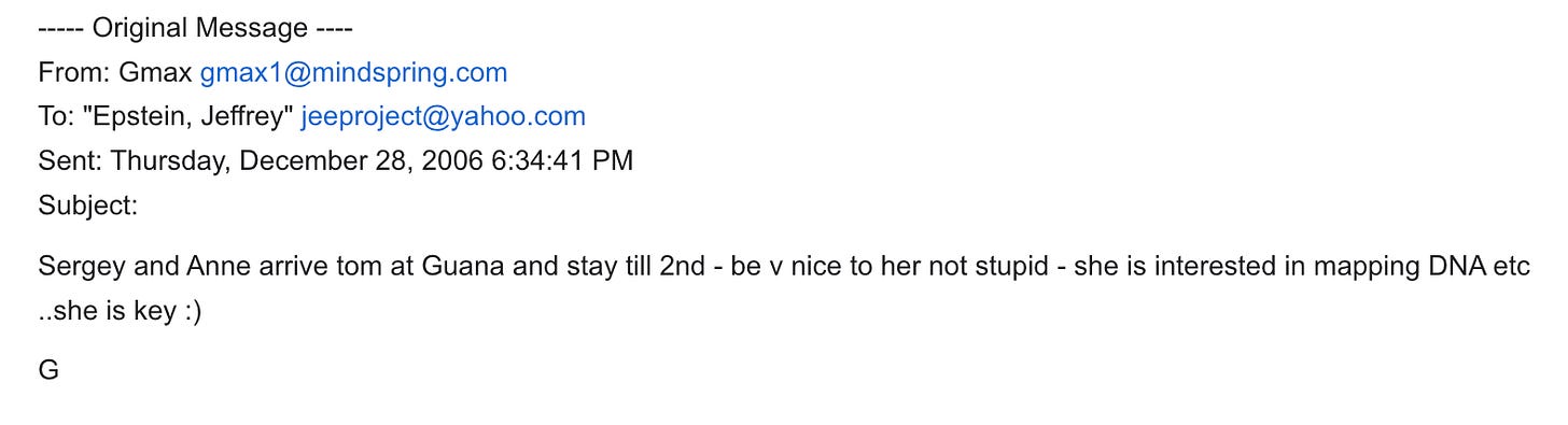 Wojcicki co-founded 23andMe. This email predates the company's consumer DNA kit launch. Maxwell was flagging the future architect of the world's largest consumer DNA database as 'key' to Epstein's network before the product even existed. Before the product even existed. Worth noting that Wojcicki's sister Susan ran YouTube, Google was famously started in their garage, their father was a particle physicist at CERN and Stanford, and Google itself grew out of a CIA and NSA-funded research grant at Stanford. But I've written about the tech-intelligence web before - while I believe all these pieces snap together like legos, that's a different rabbit hole.