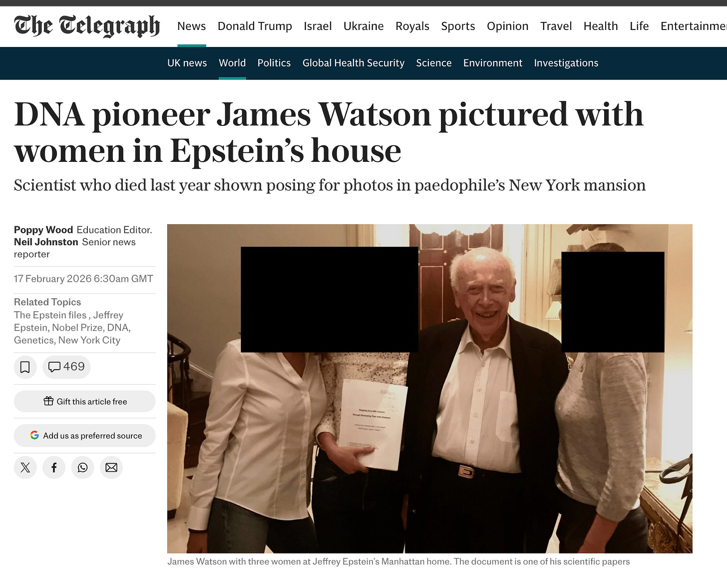 Last week, the Telegraph published photographs of James Watson - the Nobel laureate credited with co-discovering the structure of DNA - inside Epstein’s Manhattan mansion, years after his conviction, sending Epstein his research papers by FedEx. Again, zoom out and think about who was in this man’s orbit. The guy who is credited with discovering DNA. The guy who built gene drives. The guy who sequenced the Neanderthal genome. The guy who pioneered synthetic biology.
