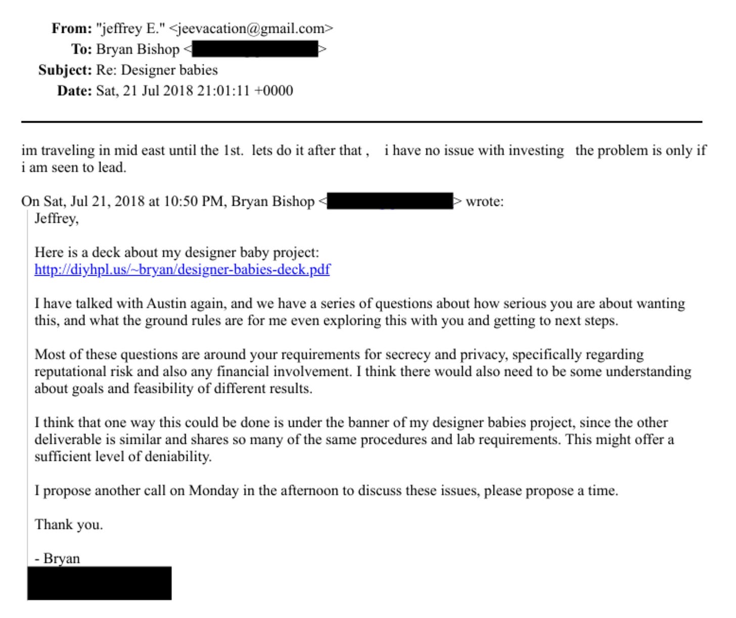 As always, follow the money. Bryan Bishop, a researcher with a Ukraine-based lab, went to Epstein with $9.5 million proposal (Ref: EFTA01003966). His pitch was for “the first live birth of a human designer baby, and possibly a human clone, within 5 years.” Epstein’s response was elucidating: “I have no issue with investing, the problem is only if I am seen to lead.”