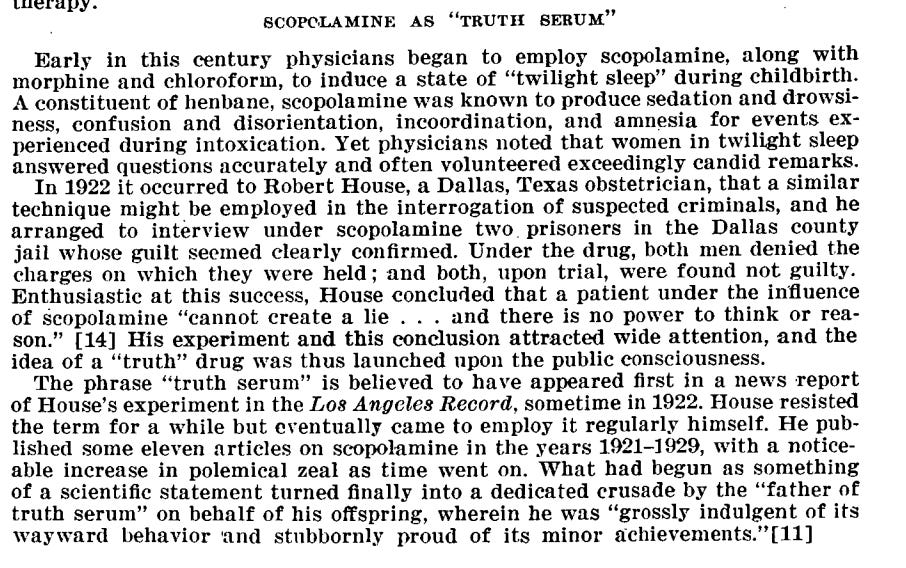 I know the mention of MKULTRA-style mind control makes some people’s eyes glaze over. But this is a core study area for me and the connection is well documented, not speculative. Scopolamine - the same drug used in twilight sleep - is the same drug the CIA documented using for interrogation in 1951, two years before MKUltra officially began.