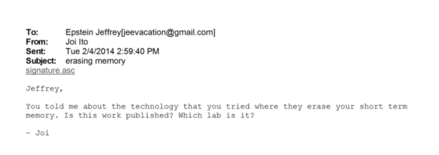 Read that again. According to Ito’s email, Epstein claimed he’d tried memory erasure technology. And he was telling people about it casually enough that the head of MIT’s most prestigious lab was asking for the citation like it was a podcast recommendation.