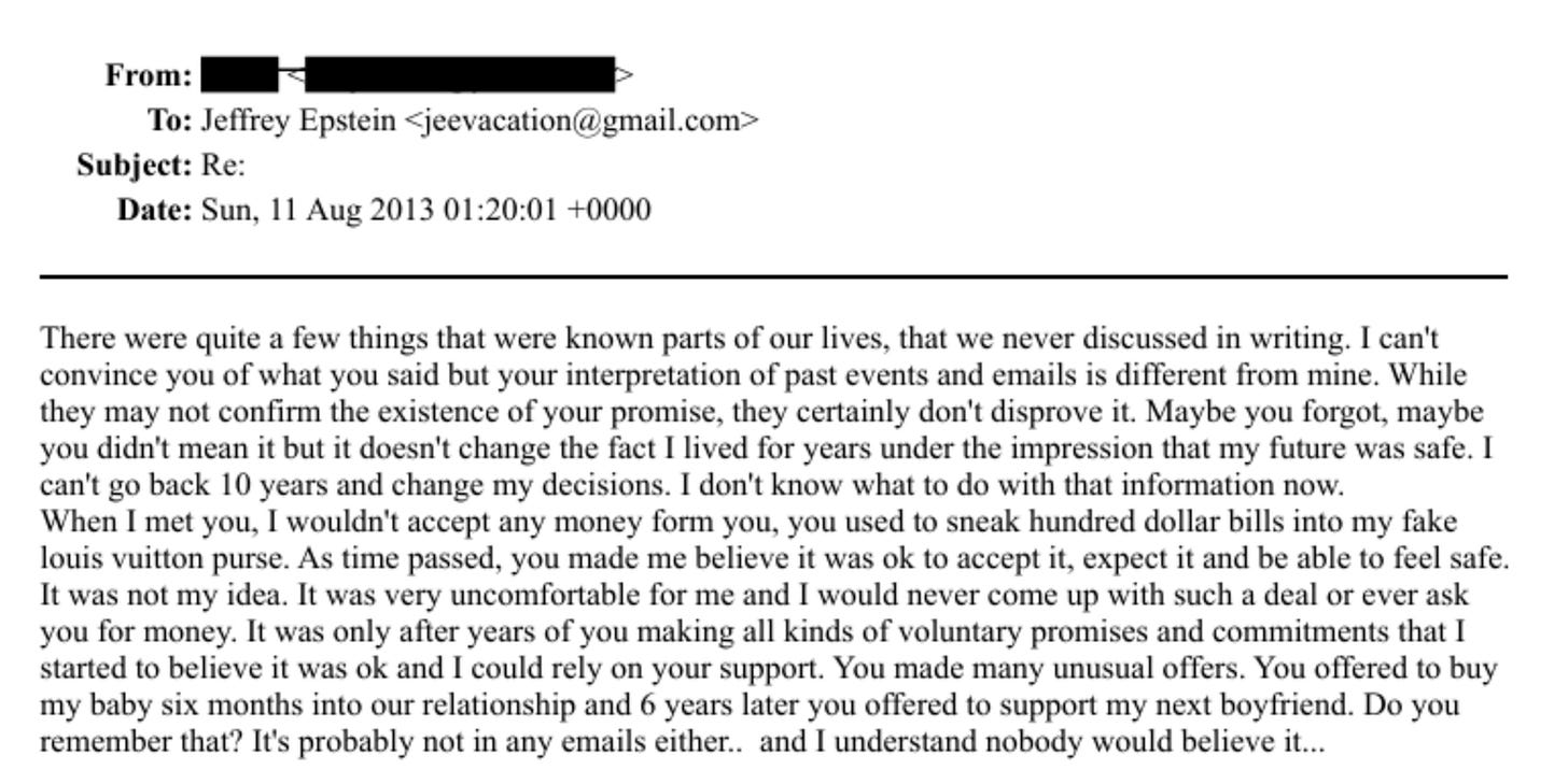 In another email (Ref: EFTA00678699), a woman writes to Epstein: 'You made many unusual offers. You offered to buy my baby six months into our relationship.' Huh? Not adopt. Buy.