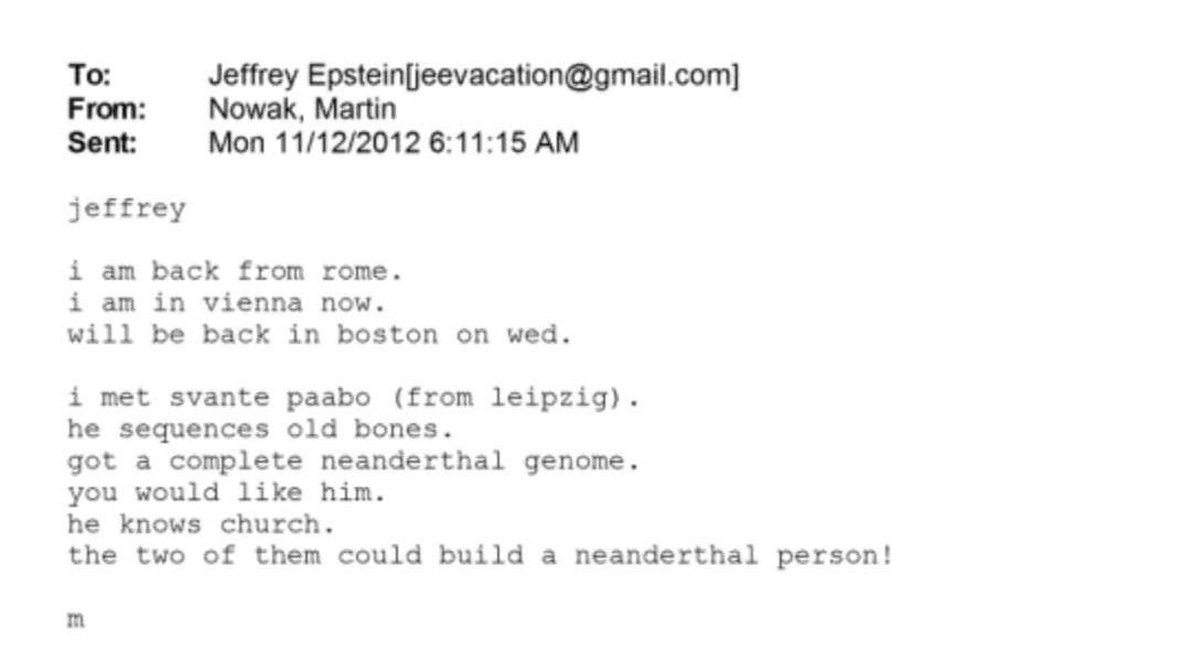 In another email (Ref: EFTA01979532), Nowak tells Epstein he met the scientist who sequenced the Neanderthal genome and says “he knows Church. the two of them could build a neanderthal person!” Then suggests Epstein would like him. Nowak was talent-scouting geneticists for a convicted sex trafficker the way you’d recommend a good restaurant.