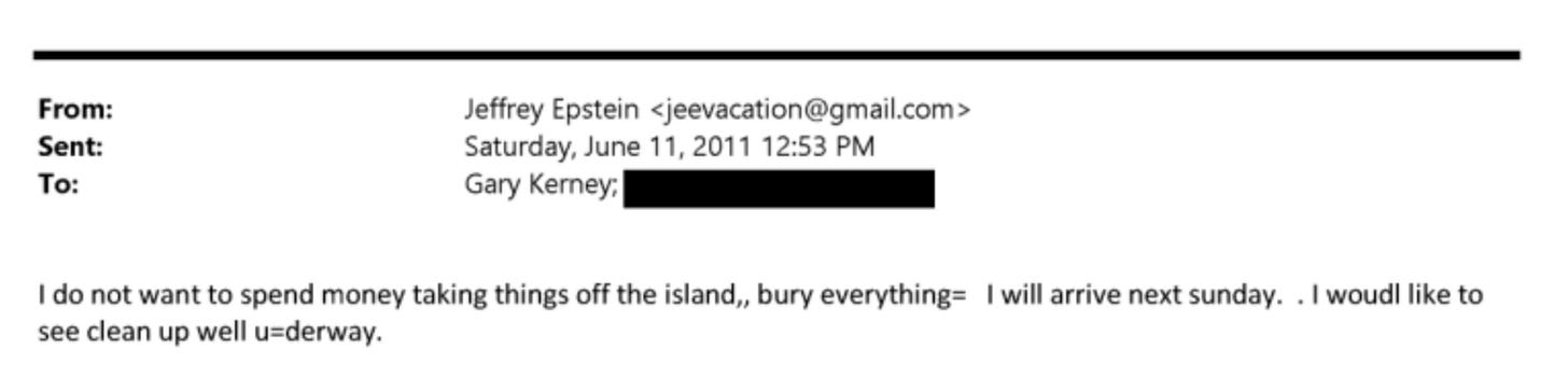 On June 11, 2011, Epstein emailed his property manager Gary Kerney (Ref: EFTA02539994): “I do not want to spend money taking things off the island, bury everything.”