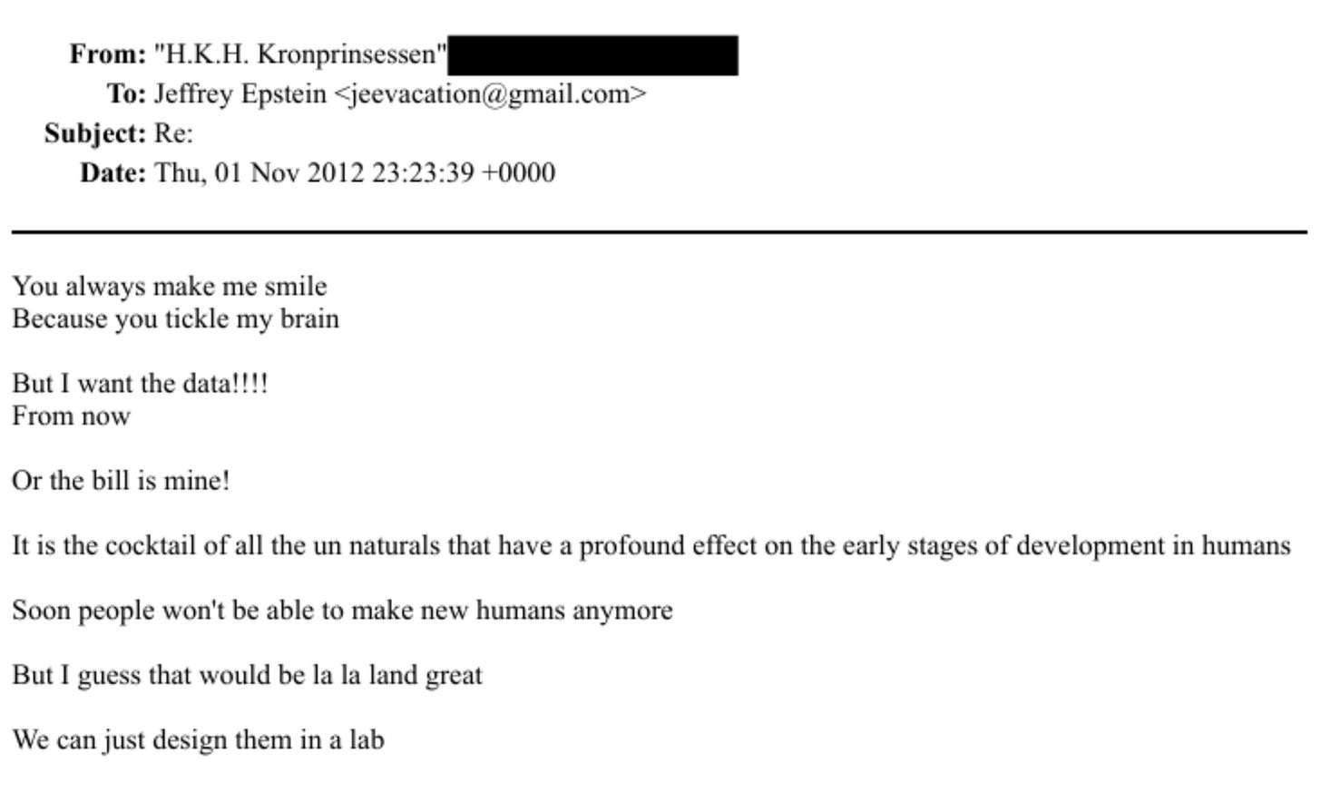 In a separate email, the Crown Princess of Norway wrote to Epstein, November 2012 (Ref: EFTA00947189): 'Soon people won't be able to make new humans anymore... We can just design them in a lab.’